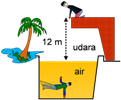 Soal No. 2). Perhatikan gambar berikut ini! Seorang anak, sebut A berada berada 12 meter diatas permukaan air sebuah kolam.