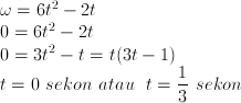 Kecepatan sudut awal masukkan t = 0 sekon pada persamaan kecepatan sudut. Karena belum diketahui turunkan persamaan posisi sudut untuk mendapatkan persamaan kecepatan sudut.
