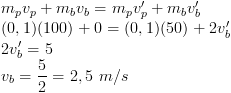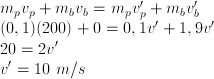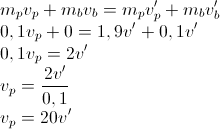 Hukum kekekalan momentum, dengan kondisi kecepatan bola sebelum tumbukan nol (vb = 0) dan kecepatan bola dan peluru setelah tumbukan adalah sama (vb’ = vp’ = v’)