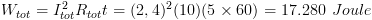 W = I2Rt = (2,4)2(2) (5×60) = 3456 joule